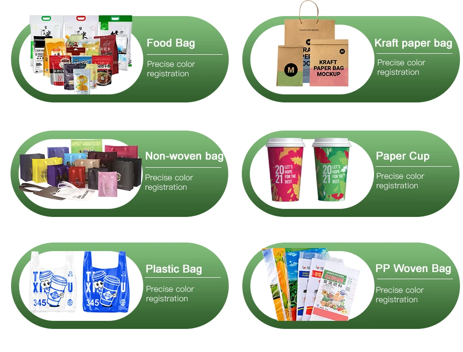 Efektywnie przetwarza różnorodne elastyczne materiały opakowaniowe, w tym PE, BOPP, PET, CPP, papier i folie laminowane, dzięki czemu idealnie nadaje się do pakowania żywności, toreb na zakupy, etykiet i opakowań przemysłowych.